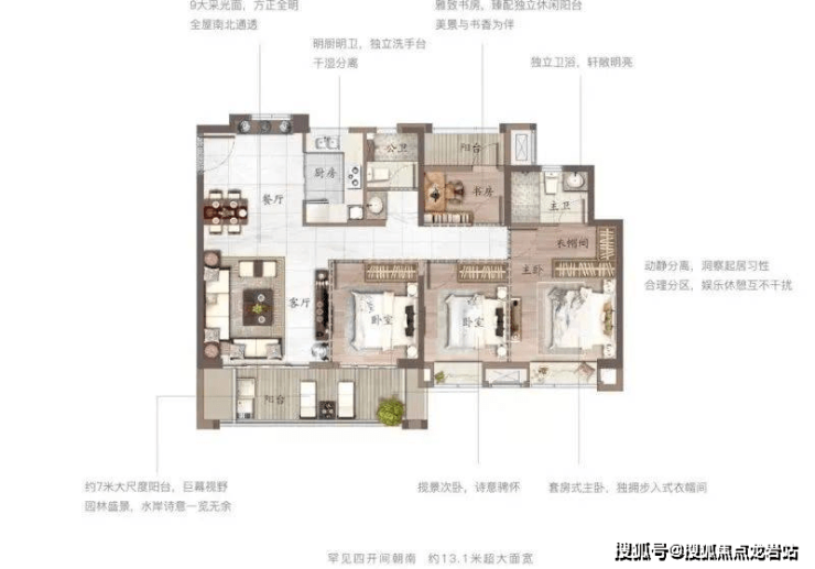 当人生进阶,唯有奢阔四室方能匹配品质生活!项目建筑面积约127㎡神户型,仅25席稀有发售!约13.1米超大面宽,罕见四开间朝南设计,全天候通风采光,鲜氧无处不在。南北双阳台,南向约7米南向瞰景阳台,匹配大人物的非凡胸襟。星级套房式主卧,享飘窗、独立卫浴、步入式衣帽间,私密尊崇享受。四室两厅两卫,奢阔尺度,犒赏进阶人生。