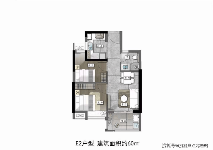60平两房一卫一厅,户型方正,户户采光,南北通透