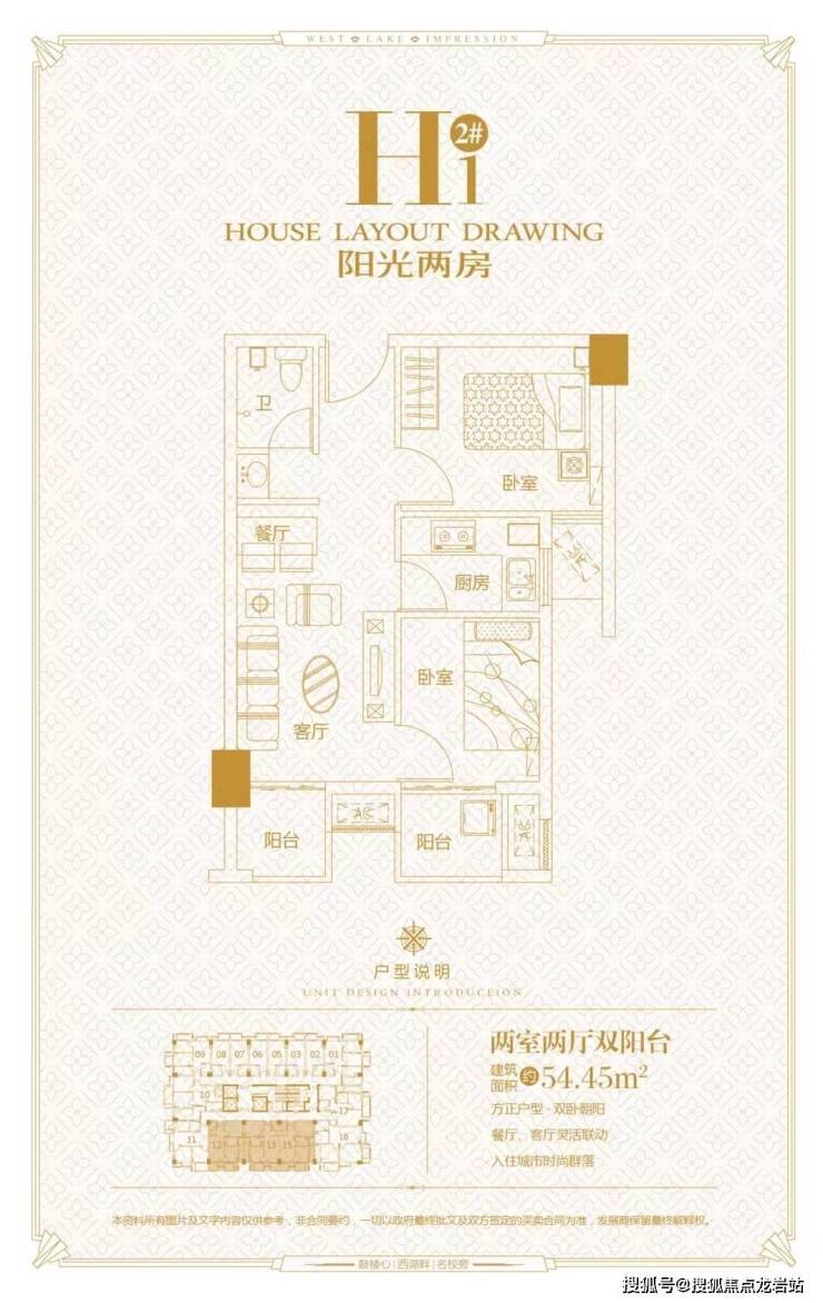 1、H1户型:54.45㎡ ,两房一厅一卫两阳台
