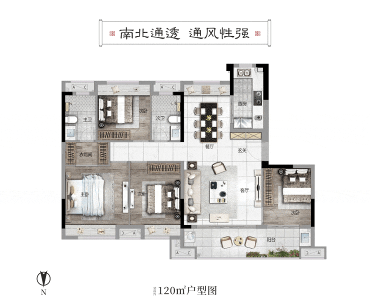 建面约120㎡户型通风效果图