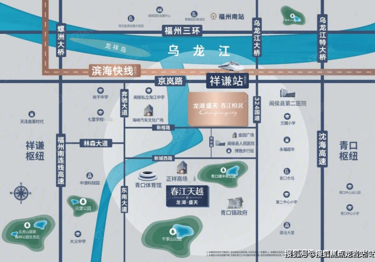 交通: F1滨海快线-祥谦站(规划中),一站直达三江口/帝封江 学校:兰圃小学、第二中心小学(规划中)、闽侯陶江私立中学 、七里学校(规划中) 商业:海峡汽车文化广场、正祥商场(待建)、金田广场、博雅步行街 医院:闽侯县第二医院、闽侯县人民医院 公园:青口镇中央公园、青口体育馆、千家山公园 优江景—— 天赐一线江岸,1000米江岸视野 优品质—— 新中式大宅,国内顶级设计院担纲 优园林—— “一轴一带、一府九境” ,约3万方御制园林 优户型—— 龙湖瞰江四房,难得89-123㎡舒阔3-4房 优物业—— 近3000条服务细则,定制龙湖式幸福"
