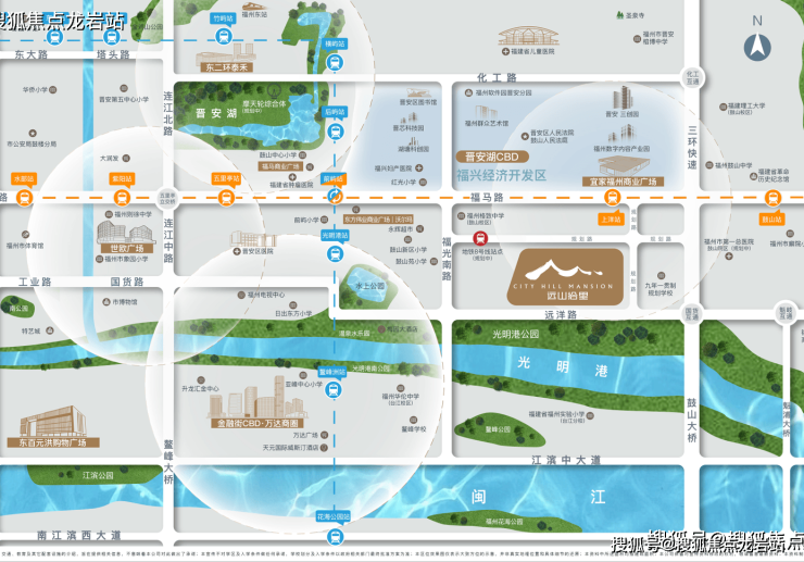 三远片区位于晋安东区,是福州市近期启动的连片旧屋区改造重点项目。片区交通配套成熟,北侧是地铁2号线上洋站,第三轮地铁8号线拟从片区内部穿过并设置三远站。项目南侧是光明港及光明港公园,具有良好的面河景观,周边生活配套有宜家商业综合体、格致中学鼓山校区、鼓山苑小学等。