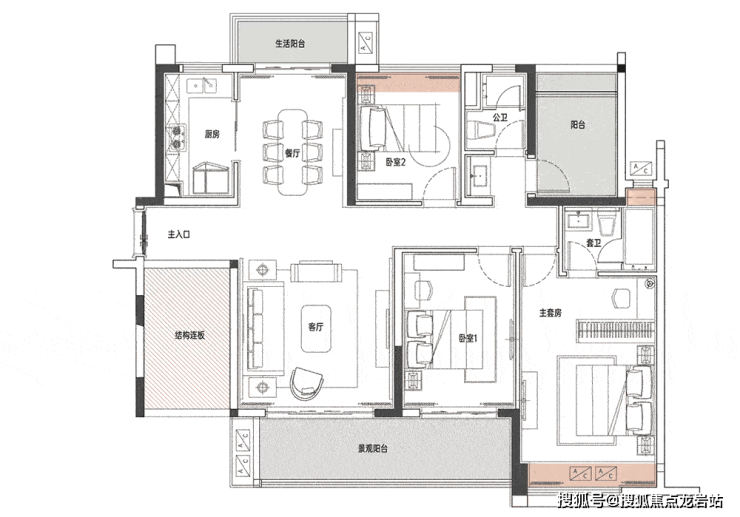 140㎡3+2房两厅两卫 建面约140㎡户型,在空间感的营造上,7.2米景观阳台,同样做到了四开间朝南+超配的尺度感+双阳台南北通透!