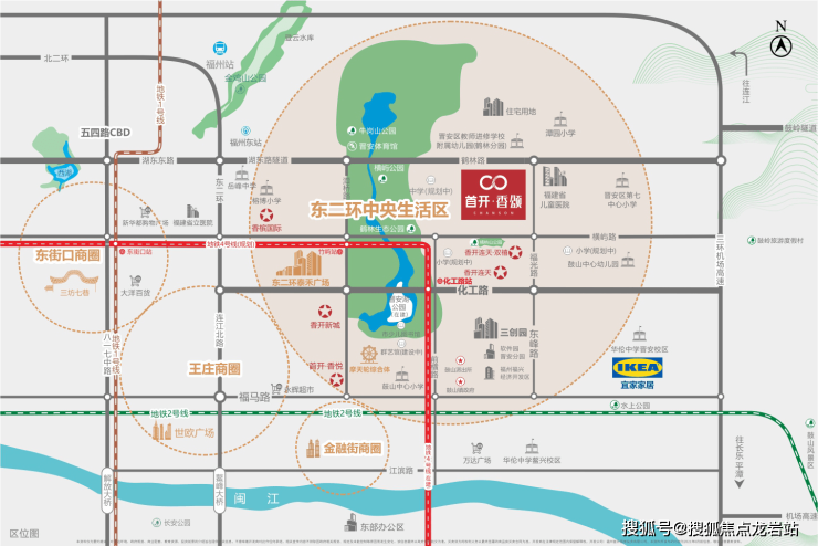 首开香颂位于项目位于东二环中央生活圈核心地段,在福州东二环泰禾旁,紧邻地铁4号线横屿站(在建中)。项目周边路网四通八达,位于东二环鹤林路上,可快速连接二环通三环。与距离城市“换乘之王”地铁4号线横屿站(在建中)约800m,可换乘地铁1/2/5/6号线,快速串联福州各区。