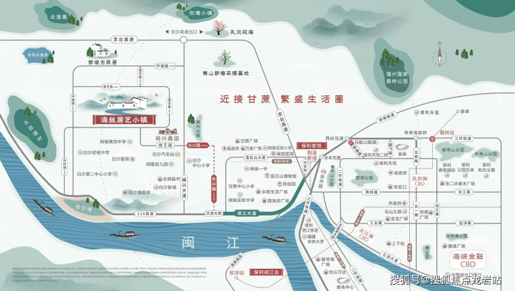 滨江大道、绕城高速、地铁8号线-闽侯站(规划中)、地铁5号线-荆溪新城站(在建)等交通资源拱卫,福州市区自驾至小镇约30分钟。