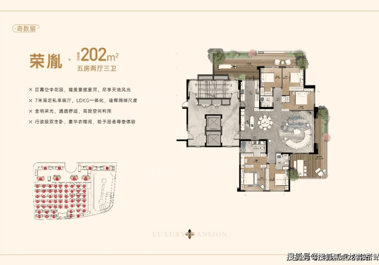 楼盘户型: 4种户型,建面:143-202㎡ 5室2厅3卫 (建面:202)